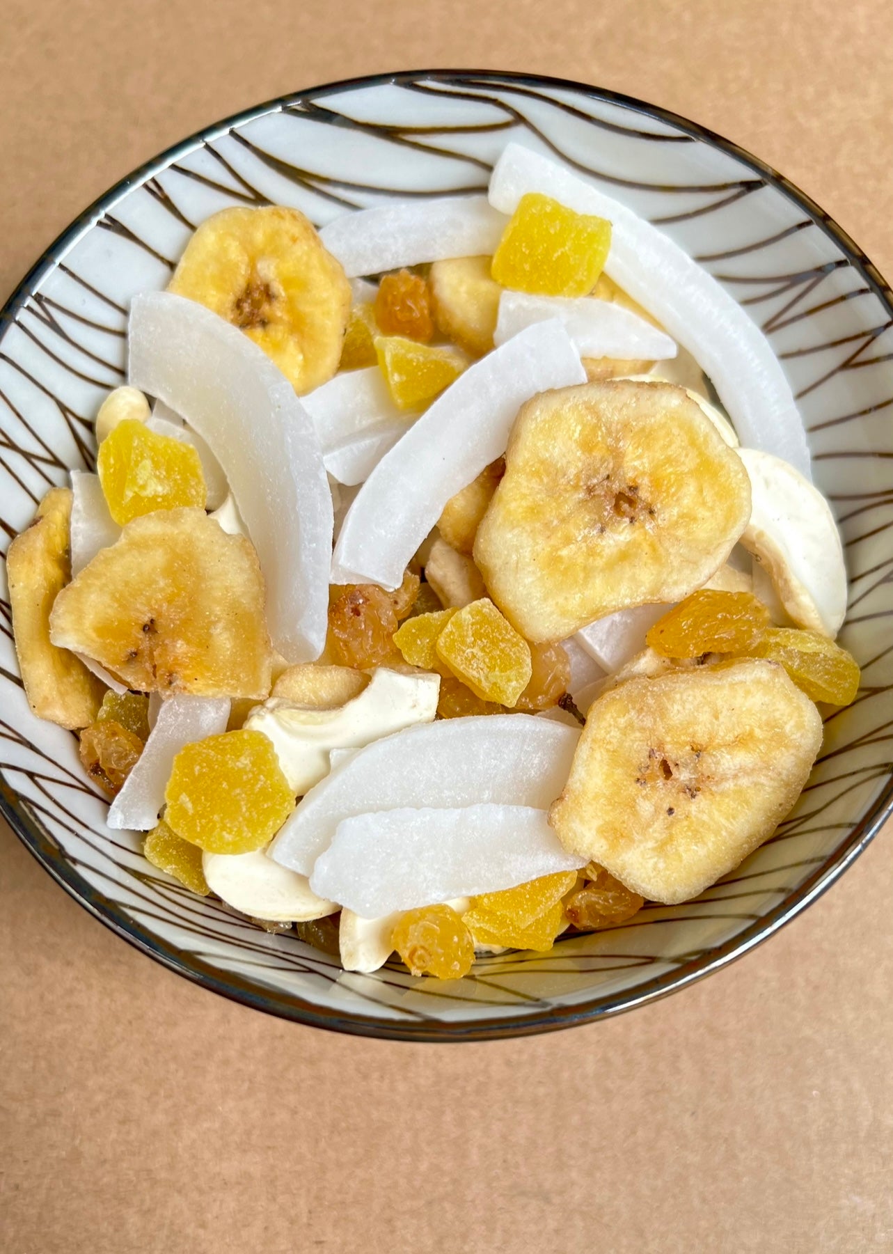 250g of banana chips, coconut slices, pineapple cubes, cashews and golden raisins.