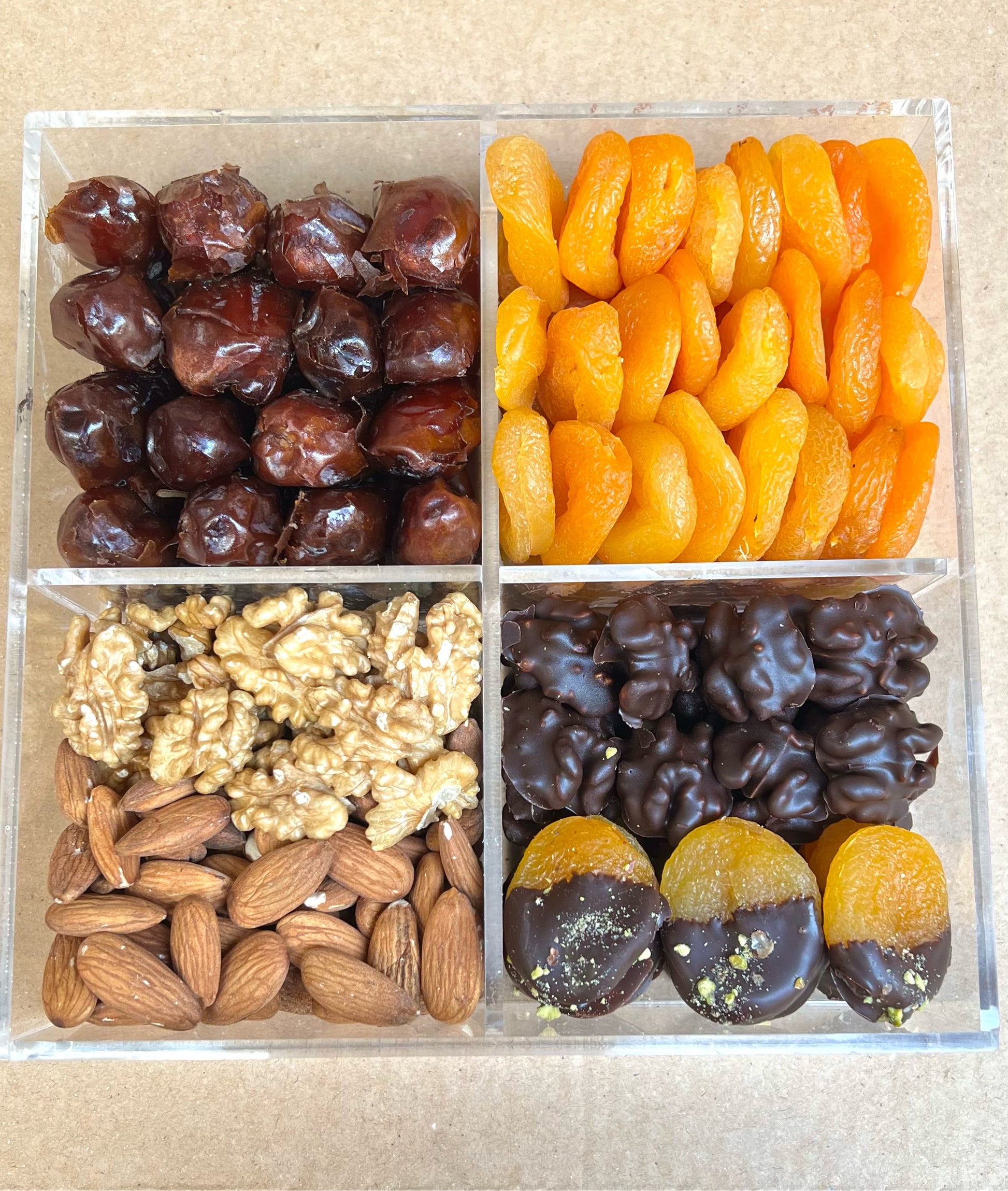 Khudri extra dates, dried apricots, almonds and walnuts, chocolate dipped apricots and walnuts.