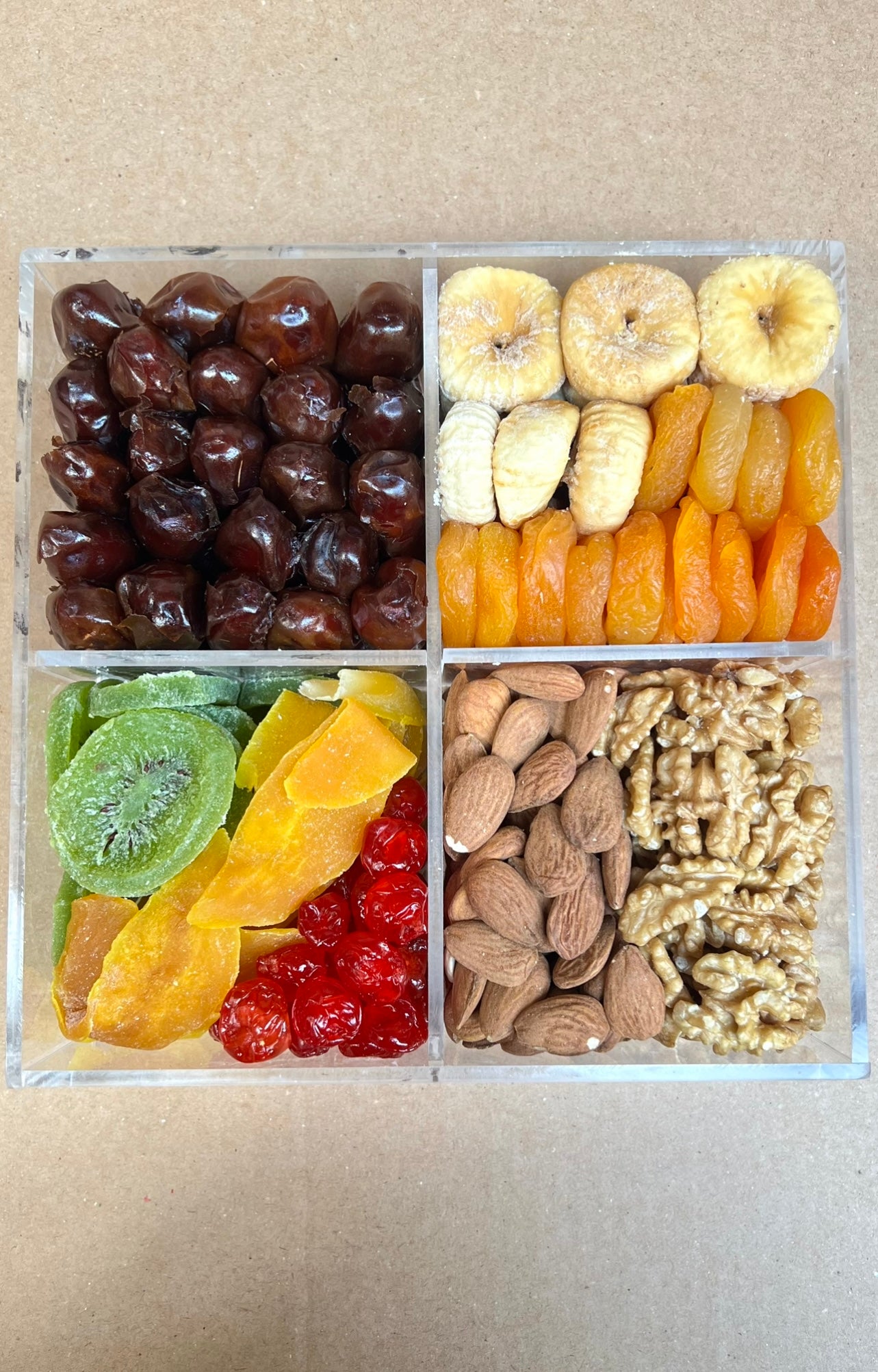 Khudri dates, apricots and figs, walnuts and almonds, dried kiwi, mango and cherries.